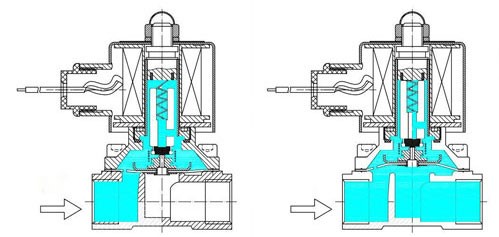 When the power is on, the solenoid coil generates the electromagnetic force to lift the closure member from the valve seat to open the valve. When the power is cut off, the electromagnetic force disappears and the spring presses the closure member on the valve seat to close the valve.